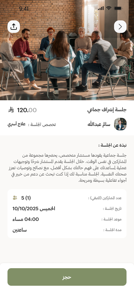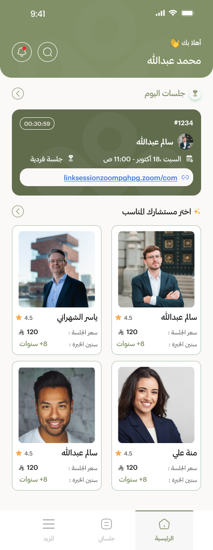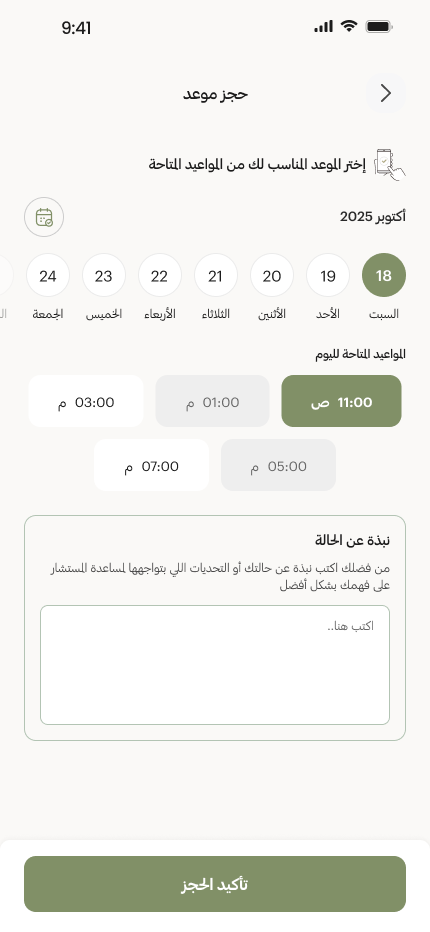ادخل على قسم المختصين، اختار الشخص المناسب ليك، حدّد الموعد اللي يناسبك، وأكّد الحجز بخطوات بسيطة من داخل التطبيق.